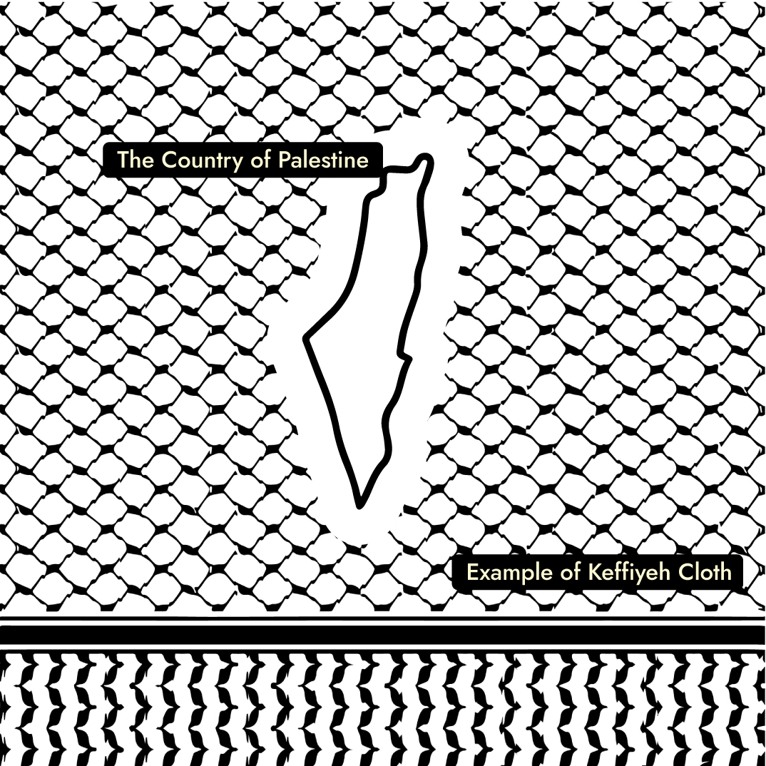This design echoes the legendary Palestinian keffiyeh (kufiya), an enduring symbol of identity, resistance, and solidarity. The pattern features the iconic fishnet grid and bold border found in the traditional black-and-white scarf worn across generations in Palestine and the Arab world.