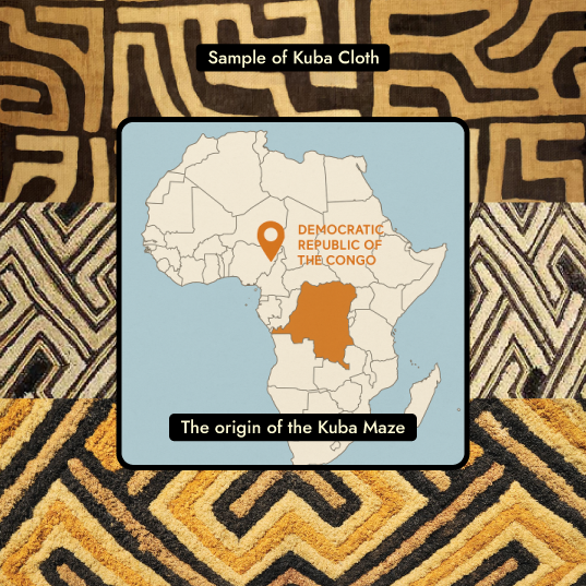 This design features a continuous, maze-like embroidery strip that bridges centuries of tradition with modern elegance. Inspired by the Kuba Kingdom of Central Africa (circa 17th century, present-day Democratic Republic of Congo), the pattern reflects the timeless geometry of Kuba cloths, which were woven and embroidered by hand using raffia palm fibers.
